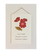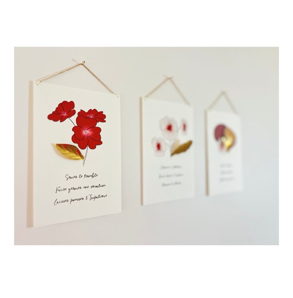Carte postale à suspendre, impression numérique sur papier d’art 300gr et montée sur une chaînette dorée. La carte est agrémentée d’une feuille en métal dorée découpée à la main ce qui confère à chaque carte son côté unique.
