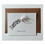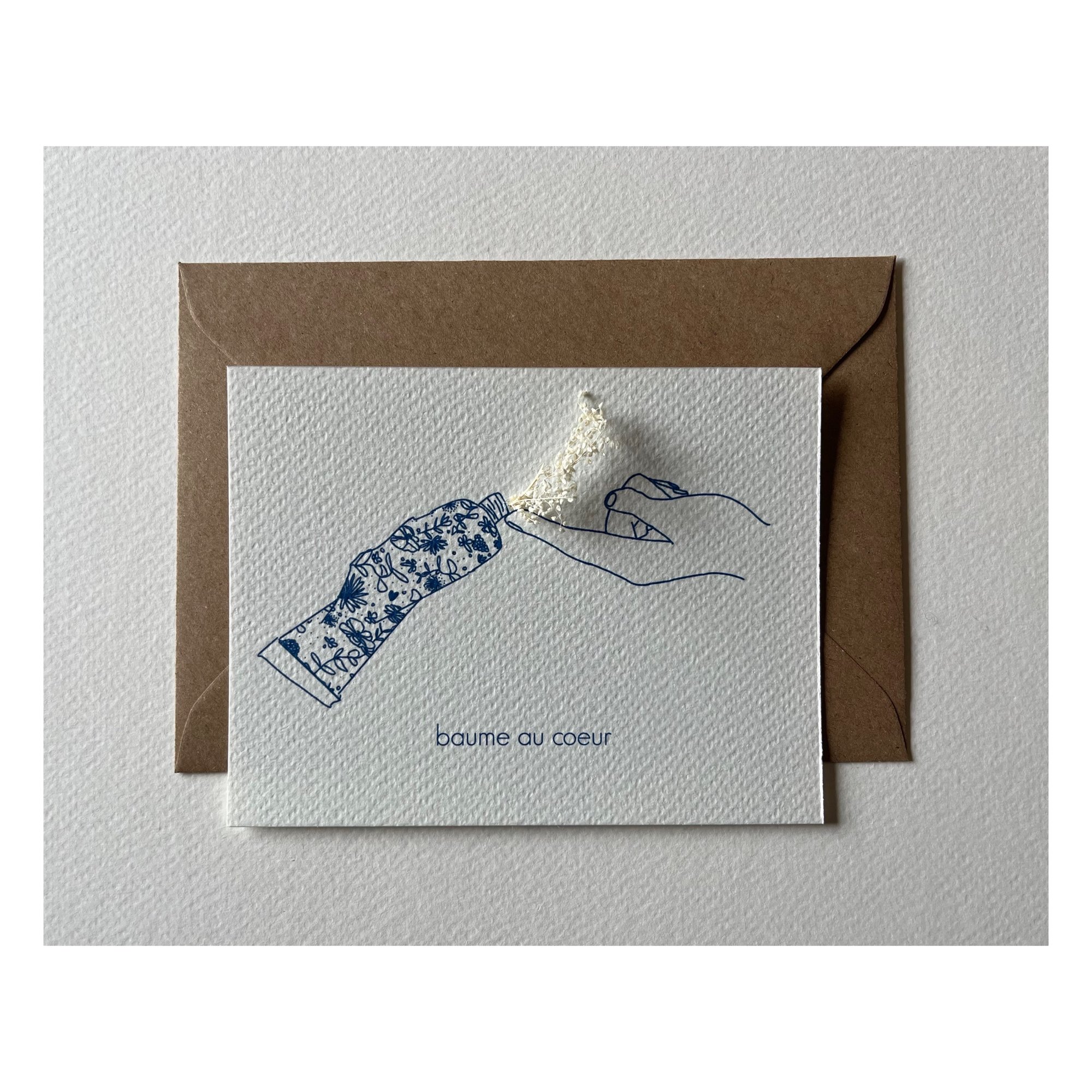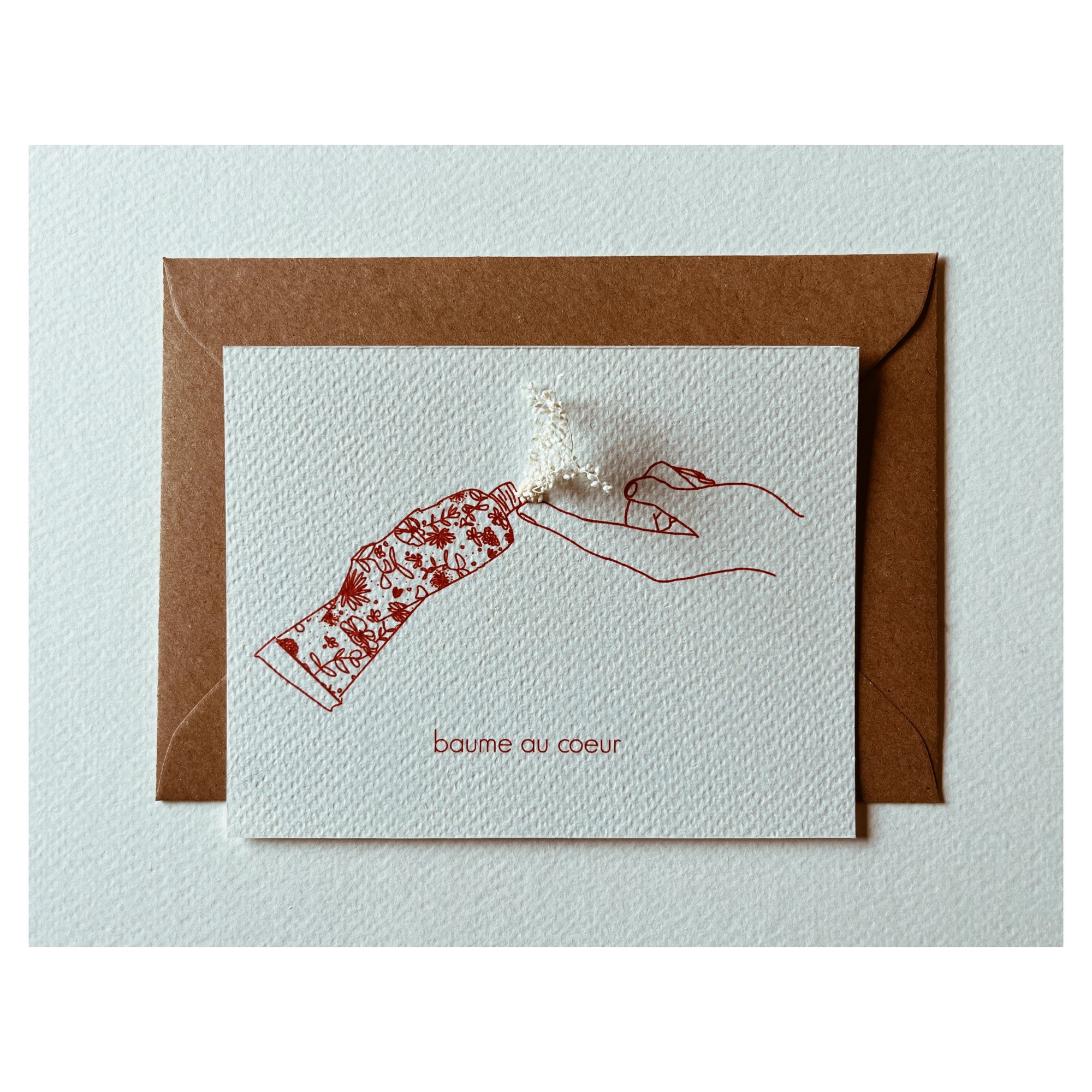 Carte postale Baume au cœur illustrée par Rozenn Bonenfant ( La Petite Marchande De Couleurs). La carte est ornée d'une fleur séchée qui peut varier selon les arrivages.