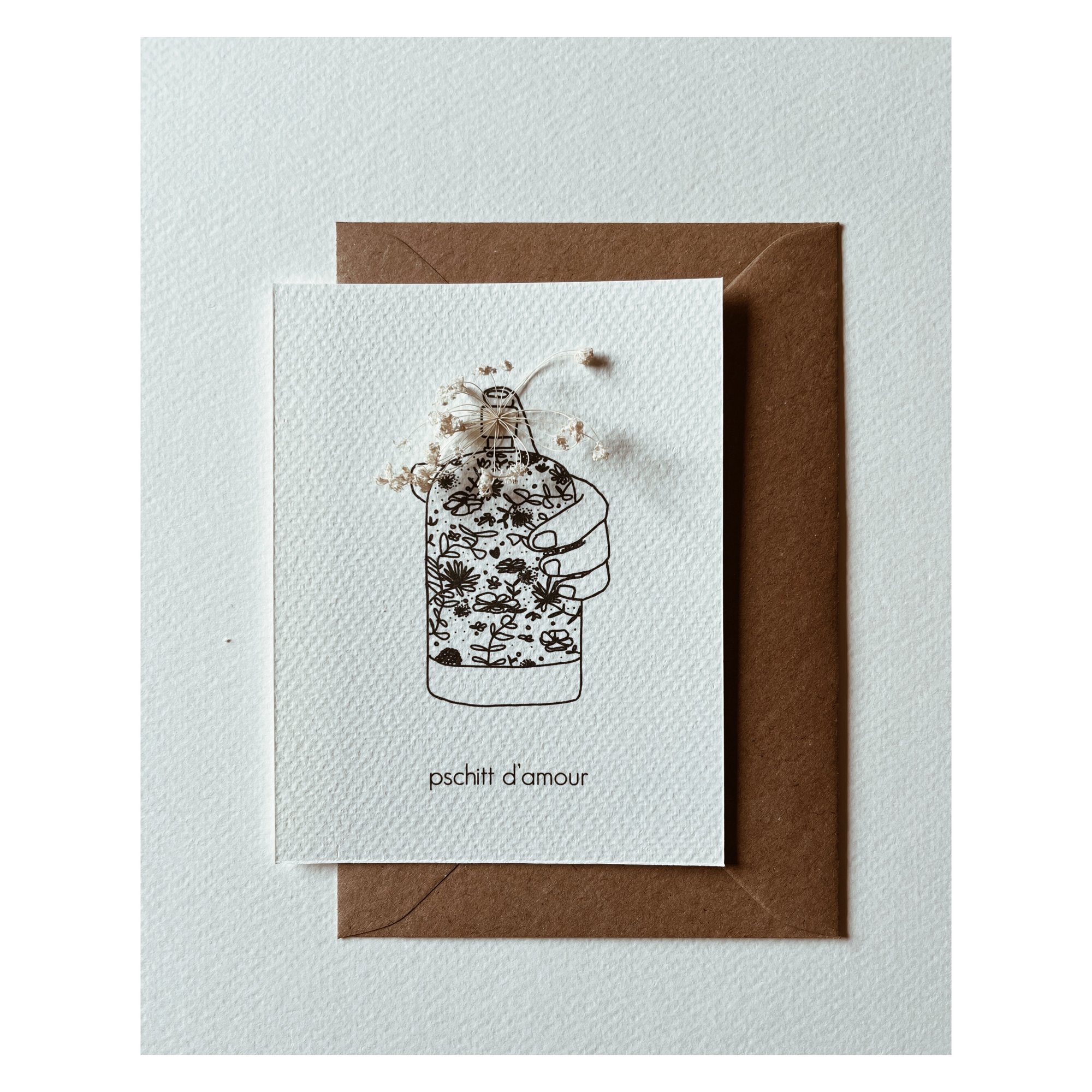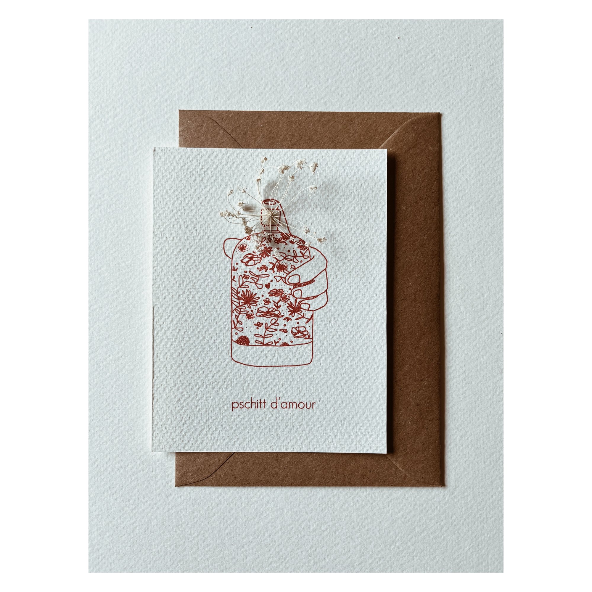 Carte postale Pschitt d'amour illustrée par Rozenn Bonenfant ( La Petite Marchande De Couleurs). La carte est ornée d'une fleur séchée qui peut varier selon les arrivages.